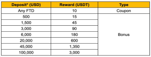 예를 들어, 비트코인 1,000달러 이더리움 5,000달러를 입금하여 총 6,000달러를 입금하게 된다면 보상으로 180USDT와 10USDT의 쿠폰을 받게 되는 것이죠.