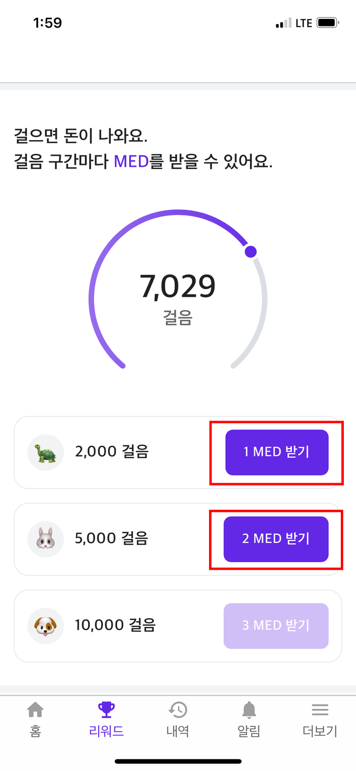 저는 7,029 걸음을 걸었고 오늘은 2,000 걸음, 5,000 걸음을 넘었기 때문에 총 3 MED를 받을 수 있습니다. 만약에 10,000 걸음을 걸었다면 3 MED 를 더 받아서 총 6 MED를 받을 수 있게 되겠죠.