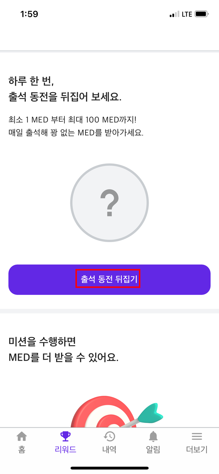 1일에 최소 7 MED를 적립할 수 있고, 출석체크에서 운이 좋으면 100 MED까지 나온다고 하는데, 항상 1 MED가 나오다가, 딱 한 번 5 MED가 나온적이 있다.