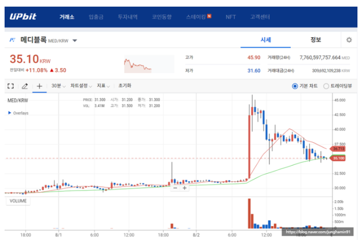 아래는 업비트 거래소에 상장된 메디블록 코인의 차트 입니다.