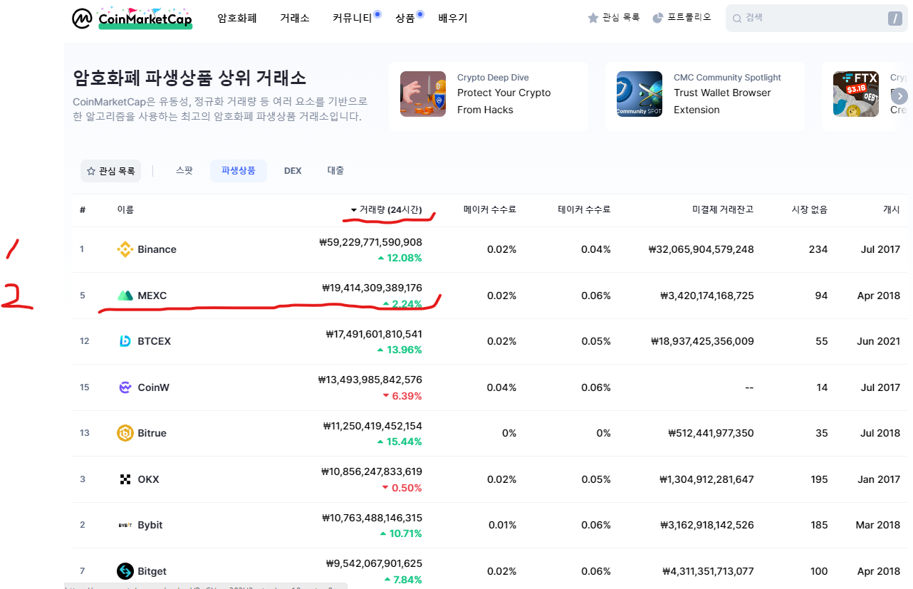 MEXC 는 현재 코인마켓캡 글로벌 파생 거래소 순위 탑5 안에 드는 상위권 대형 거래소 입니다.
