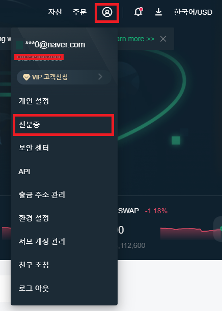 우선 MEXC거래소 가입을 마치셨다면 매인 화면으로 돌아와 다시 로그인을 해준 후, 우측 상단에 있는 사람 모양 아이콘에 커서를 올려 '신분증' 탭으로 이동해주시면 됩니다.