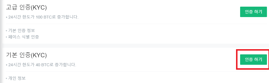 본인이 수십억 이상의 자본을 굴리는 것이 아닌 이상 고급 인증의 경우는 크게 안 하셔도 상관은 없습니다. 우선 기본 인증으로 진행을 해보도록 하겠습니다.