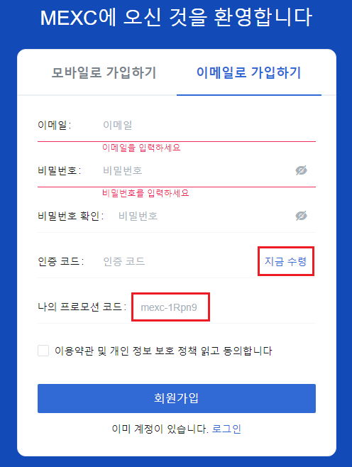마지막 부분에 있는 나의 프로모션 코드 부분에 'mexc-1Rpn9' 가 기입되어있는지 마지막으로 확인하셔야 합니다. 만약 프로모션 코드가 기입되지 않은 상태로 가입을 진행하게 될 경우 수수료 할인 혜택과 증정 금 지급 이벤트에 참여하실 수 없기 때문에 마지막에 꼭 확인하는 것을 잊지 말아 주세요.