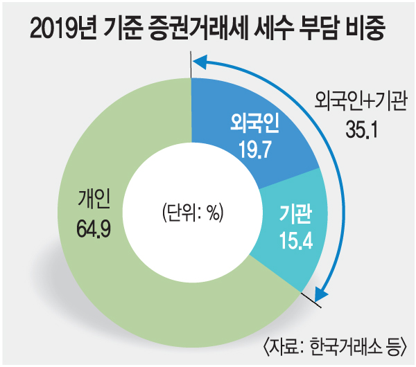 정부 발표대로 2023년부터 증권거래세가 0.10% 포인트 내려가면 기관과 외국인의 수익은 되레 늘어나고 개인만 실질적으로 추가 과세 부담을 지는 셈이다. 기관·외국인의 증권거래세 부담을 개인에게 전가한다는 지적도 따라 붙을수밖에 없다.